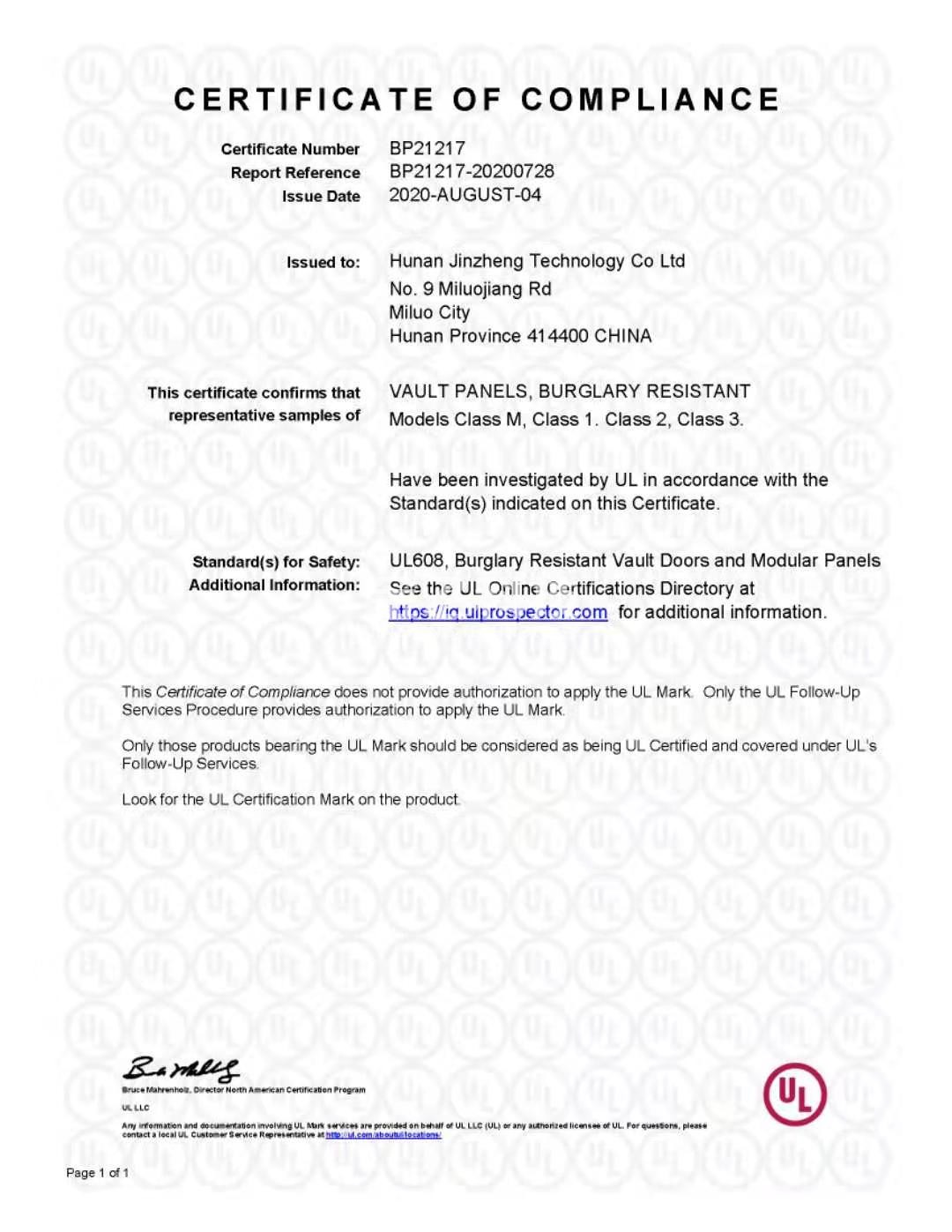 湖南水蜜桃在线播放科技有限公司生产的国产又色又爽又黄水蜜桃视频、金库壁板、金库通风口三款产品成功通过美国UL-608全系列认证(M级、1级、2级、3级)
